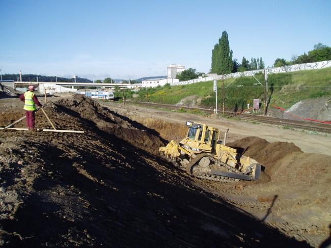 Popis: Zemní práce na zářezu kolejí Libeň-Masarykovo nádraží