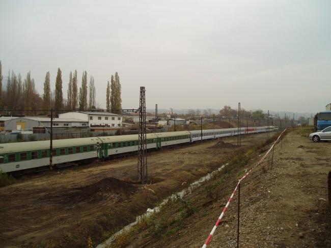 Popis: Mezinárodní rychlík projíždí pod kolem původních i nových trakčních stožárů zářezu Libeň - Masarykovo n.
